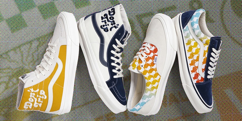 Arriving in “Marshmallow” and “Dress Blues,” each Sk8-Hi is based around an embroidered “Don’t Trip” graphic on its lateral collar. The former uses a yellow base with a cream toebox and accents, while the latter looks to a white base with navy toeboxes, throats and accents. Elsewhere, the Old Skool and Era follow a similar sunrise/sunset yin and yang of colors, taking on either navy blue or cream tones for a day and night look. Unity is provided by a repeating yin and yang logo with a cool-toned gradient fade that’s swathed across each shoe’s quarter. Collaborative apparel is present as well.